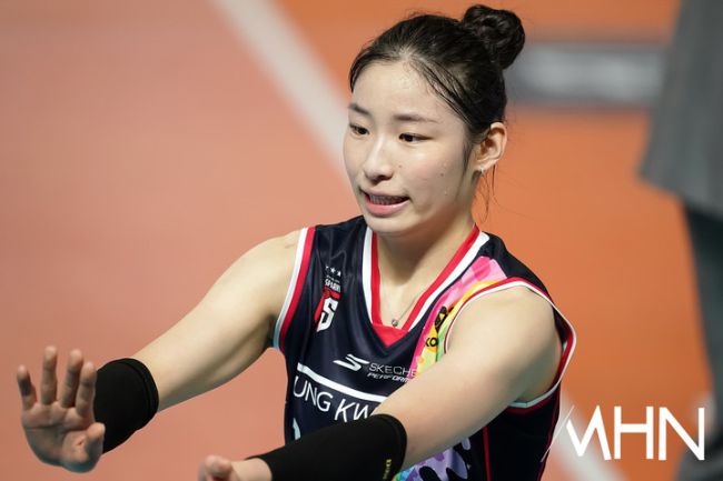 19일 대전충무실내체육관에서 '2025-2026 V-리그 여자부' 정관장 대 GS칼텍스 경기가 열렸다. 이날 정관장의 새로운 아시아 쿼터 선수 몽골 출신 아웃사이드 히터 자미얀푸렙 엥흐서열(등록명 인쿠시)가 새로운 무대 데뷔전을 펼쳤다. 인쿠시가 경기를 펼치고 있다.