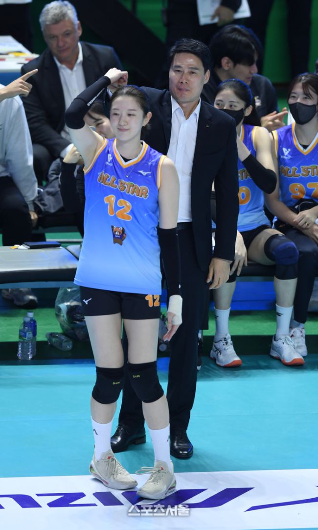 이다현과 강성형 감독이 25일 춘천 호반체육관에서 열린 2025-2026 V-리그 올스타전에서 댄스를 추고 있다. 2026. 1. 25.춘천 | 최승섭기자 thunder@sportsseoul.com 사진 | 한국배구연맹 “전혀 계획이 없었다.”(신영석) “얼떨떨하다.”(이다현) 남자부 신영석(한국전력)과 여자부 이다현(흥국생명)은 25일 강원도 춘천 호반체