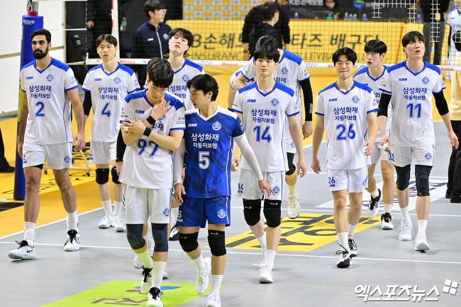 24일 오후 경기도 의정부 경민대체육관에서 열린 '진에어 2025-2026 V-리그' KB손해보험과 삼성화재의 경기, KB손해보험이 삼성화재에 세트스코어 3:1(25-20 18-25 25-16 25-23) 승리했다. 삼성화재 선수들이 아쉬워하고 있다. 김한준 기자 kowel@xportsnews.com