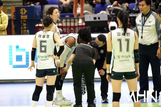 [mhn포토] 부상 당한 모마, 걱정스러운 팀원들
