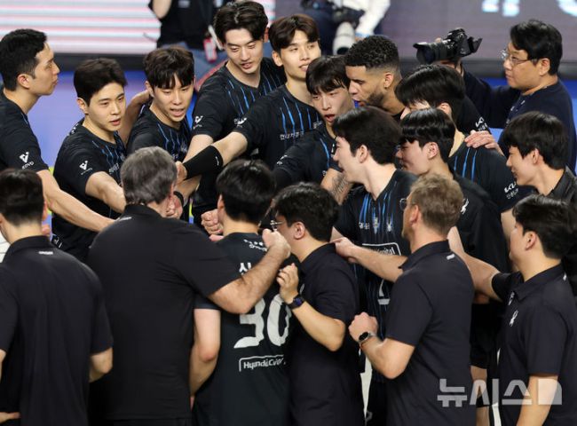 [천안=뉴시스] 홍효식 기자 = 27일 충남 천안 유관순체육관에서 열린 2025-2026 V-리그 남자부 플레이오프 1차전 현대캐피탈과 우리카드의 경기, 세트스코어 3-2로 승리한 현대캐피탈 선수들이 기뻐하고 있다. 2026.03.27. yesphoto@newsis.com [사진 영상 제보받습니다] 공감언론 뉴시스가 독자 여러분의 소중한 제보를 기다립니다.