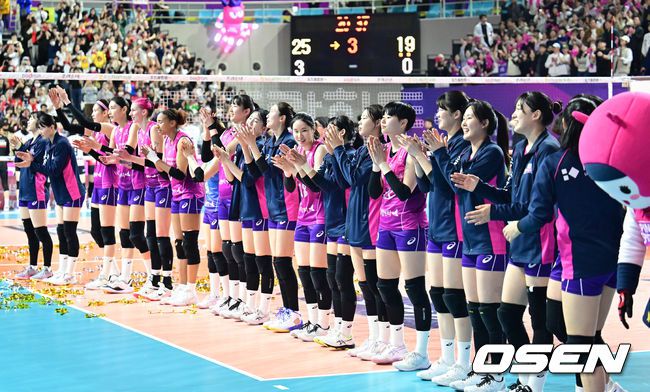 흥국생명이 챔피언결정전 티켓을 거머쥐었다.정관장과 흥국생명은 26일 인천 삼산월드체육고나에서 열린 도드람 2023-2024 V리그 여자부 플레이오프 3차전에서 세트 점수 3-0(25-18, 25-19, 25-19) 승리를 거뒀다. 경기 종료 후 흥국생명 선수들이 관중을 향해 인사를 하고 있다. 2024.03.26 / ksl0919@osen.co.kr 흥국생