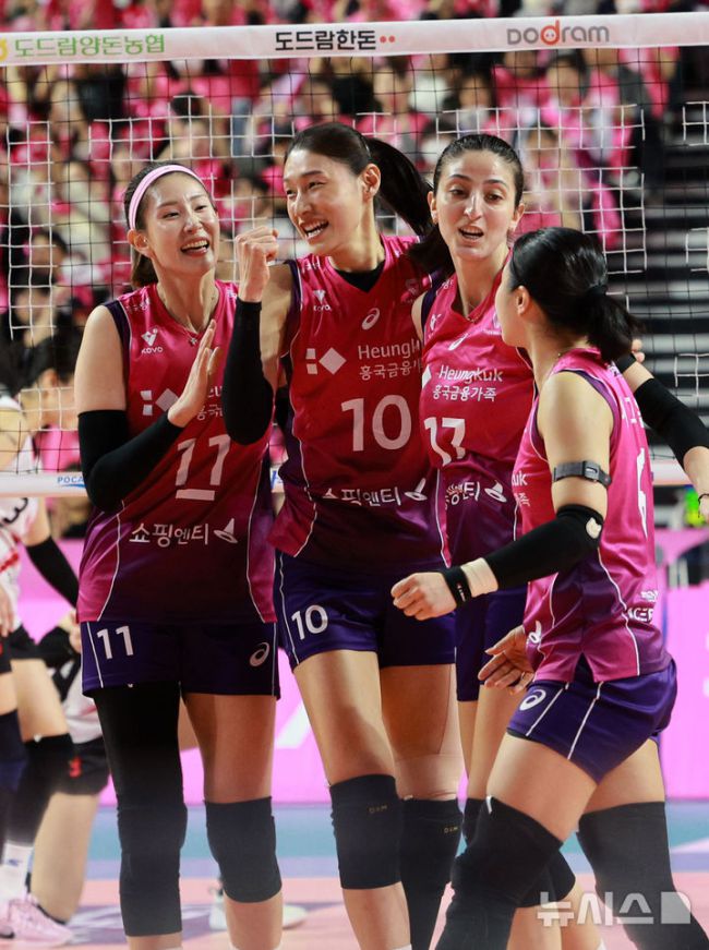 [인천=뉴시스] 고범준 기자 = 31일 인천 부평구 삼산월드체육관에서 열린 2024~2025 V-리그 여자부 챔피언결정전(5전 3선승제) 1차전 흥국생명 핑크스파이더스와 정관장 레드스파크스의 경기, 흥국생명 김연경 등 선수들이 득점에 성공하자 기뻐하고 있다. 2025.03.31. bjko@newsis.com [서울=뉴시스]정병혁 기자 = 여자 프로배구 흥국