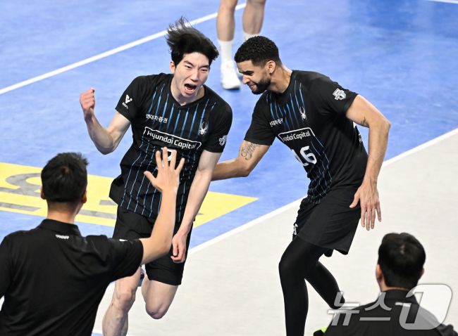 3일 천안 유관순체육관에서 진행된 프로배구 24-25시즌 도드람 v-리그 챔피언결정전 2차전 현대캐피탈과 대한항공의 경기에서 현대캐피탈 허수봉과 레오가 승리 후 환호하고 있다. (한국배구연맹 제공, 재판매 및 DB 금지) (인천=뉴스1) 권혁준 기자 = 19년 만의 통합 우승에 트레블까지. 남자 프로배구 현대캐피탈이 압도적 시즌을 보낸 데에는 이방인 '우승