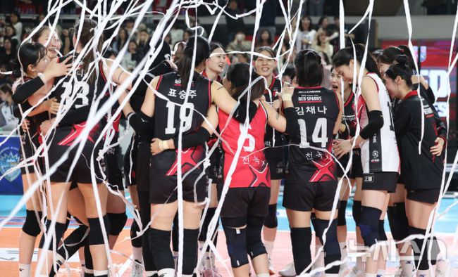 [대전=뉴시스] 황준선 기자 = 지난 6일 대전 중구 충무체육관에서 열린 2024~2025 V-리그 여자부 챔피언결정전 4차전 흥국생명 핑크스파이더스와 정관장 레드스파크스의 경기, 세트스코어 3-2로 승리한 정관장 선수들이 자축하고 있다. 2025.04.06. hwang@newsis.com [서울=뉴시스]문채현 기자 = 대망의 5차전이다. 여자배구 흥국생명
