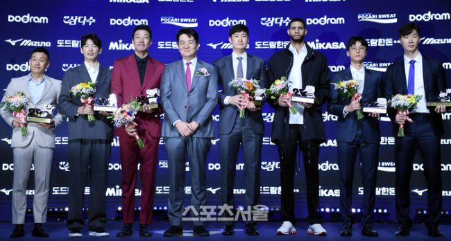 20주년 BEST7(남)으로 선정된 여오현, 한선수, 신영석, 이선규, 레오, 곽승석, 박철우(왼쪽부터)가 14일 서울 서대문구 스위스 그랜드 호텔에서 열린 2024~2025 V-리그 시상식에서 조원태 총재와 기념촬영을 하고 있다. 2025. 4. 14.최승섭기자 thunder@sportsseoul.com 한국배구연맹은 14일 서울 홍은동 스위스 그랜드 호
