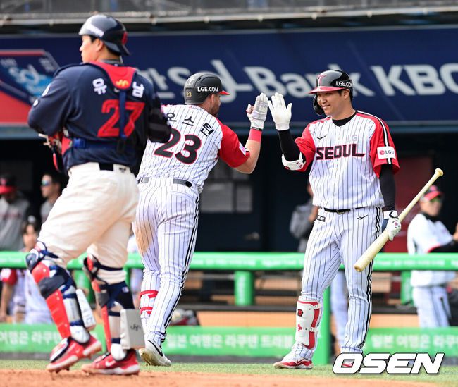23일 오후 서울 잠실야구장에서 2025 신한 SOL Bank KBO리그 LG 트윈스와 롯데 자이언츠의 경기가 열렸다.이날 LG는 손주영, 롯데는 박세웅을 선발로 내세웠다.5회말 2사에서 LG 오스틴이 좌월 솔로포를 날리며 문보경과 기뻐하고 있다. 2025.03.23 / jpnews@osen.co.kr 프로야구 LG 트윈스가 3연승에 도전한다. 한화 이글스