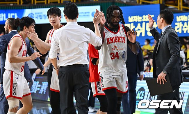 15일 창원 체육관에서 2024-2025 KCC 프로농구 창원 LG와 서울 SK의 챔피언결정전 6차전 경기가 열렸다. 서울 SK가 창원 LG와의 챔피언결정전에서 3연패 후 2연승하며 ‘리버스 스윕’을 노리고 있다.서울 SK 자밀 워니가 전반을 29-17로 앞선 후 전희철 감독과 기쁨을 나누고 있다. 2025.05.15 / foto0307@osen.co.kr
