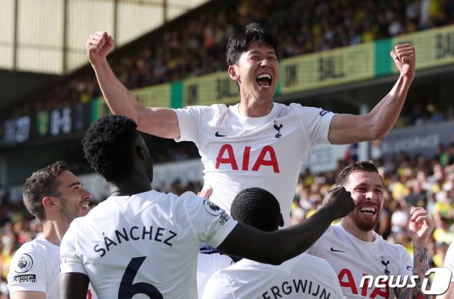 손흥민이 22일(현지시간) 영국 노리치의 캐로 로드에서 열린 EPL 노리치 시티와 경기서 2골을 몰아치며 시즌 23호골을 기록해 아시아 선수로는 처음으로 EPL 득점왕에 올라 기뻐하고 있다. © 로이터=뉴스1 (서울=뉴스1) 이재상 기자 = 잉글랜드 프리미어리그(EPL) 득점왕이라는 새 이정표를 쓴 손흥민(30·토트넘)이 상승세를 '벤투호'에서 이어간다.