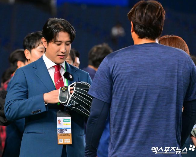 5일 오후 일본 도쿄돔에서 열리는 2026 월드베이스볼클래식(WBC) C조 체코와 대한민국의 경기, 황재균 해설위원이 류현진과 인사를 나누고 있다. 김한준 기자 kowel@xportsnews.com