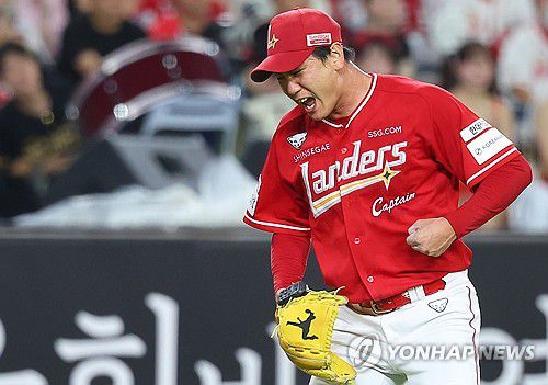 위기탈출 김광현 (대전=연합뉴스) 김도훈 기자 = 26일 대전 한화생명 볼파크에서 프로야구 2025 신한 SOL 뱅크 KBO리그 SSG 랜더스와 한화 이글스 경기. 6회말 2사 3루 SSG 선발 김광현이 땅볼로 위기를 탈출한 뒤 환호하고 있다. 2025.7.26 superdoo82@yna.co.kr (대전=연합뉴스) 김경윤 기자 = 김광현은 주먹을 불끈 쥐