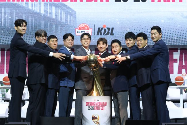 KCC, LG 각 4표씩 ‘우승 후보’ KCC “라건아 있는 가스공사 강팀” KBL 각 팀 감독들이 개막 미디어데이에서 우승 트로피를 잡고 포즈를 취하고 있다. 사진 | KBL 선수들의 예상 역시 크게 다르지 않았다. 2025~2026시즌 KBL 개막을 앞두고 열린 미디어데이에서 10개 구단 감독과 선수들이 꼽은 우승 후보는 KCC와 LG다. ‘슈퍼팀’ K