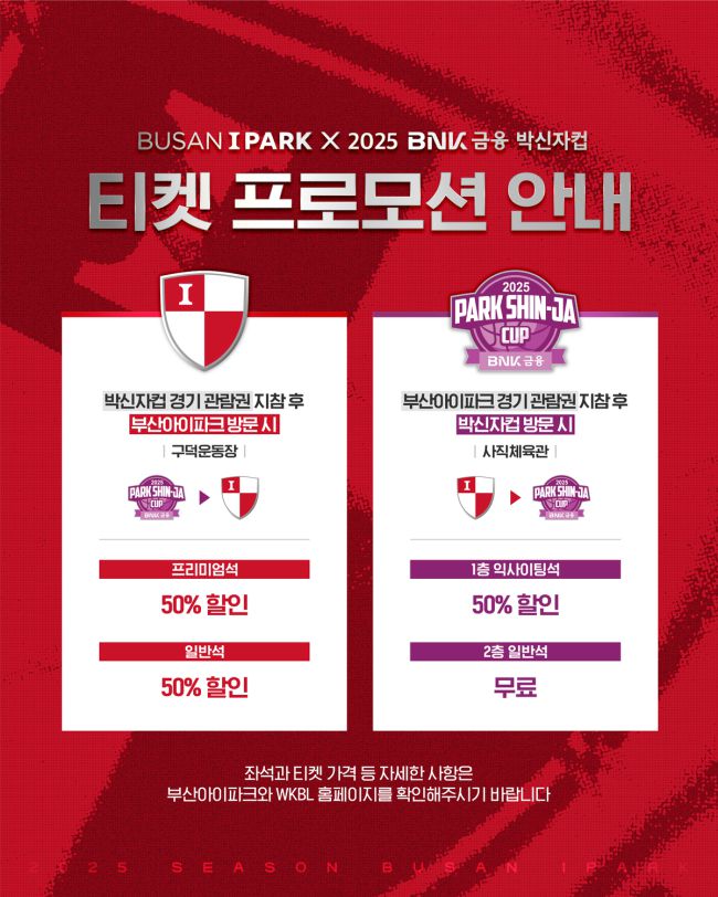 사진=부산 아이파크 제공 프로축구 K리그2 부산 아이파크가 한국여자농구연맹(WKBL)과 손잡았다. 부산은 “구단 홈 경기와 2025 BNK금융 박신자컵 홍보를 위해 공동 프로모션을 진행한다”고 7일 밝혔다. 박신자컵은 오는 30일부터 9월7일까지 부산 사직실내체육관에서 개최된다. 4개국 10개 프로팀이 경쟁해 우승을 가린다. 팬들은 이번 프로모션을 통해 합