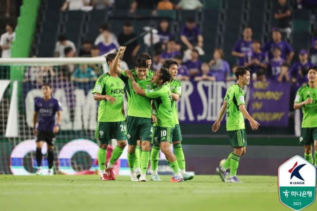 전북 박진섭(가운데)이 8일 안양전에서 선제골을 터뜨린 뒤 환호하고 있다. 사진 | 한국프로축구연맹 전북 박진섭(가운데)이 8일 안양전에서 선제골을 터뜨린 뒤 환호하고 있다. 사진 | 한국프로축구연맹 전북 현대의 질주가 멈출 줄 모른다. 전북은 8일 전주월드컵경기장에서 열린 ‘하나은행 K리그1 2025’ 25라운드 FC안양과 맞대결에서 2-1로 승리했다.