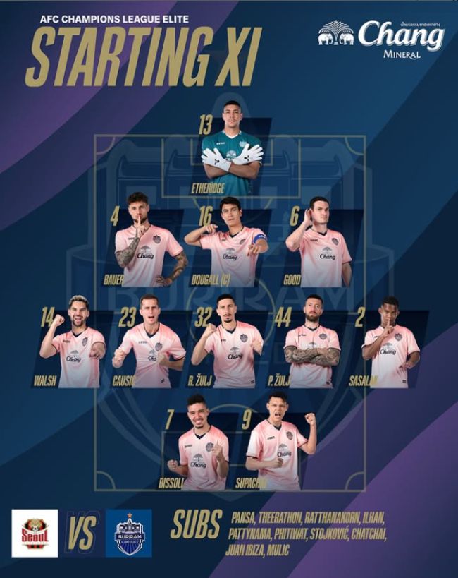 부리람 유나이티드는 태국의 프로축구 클럽이지만, 정작 선발 명단에 자국 선수는 고작 두 명 뿐이다. 30일 서울월드컵경기장에서 열리는 FC서울과 부리람의 2025-2026시즌 아시아축구연맹(AFC) 챔피언스리그 엘리트(ACLE) 동부그룹 리그 페이즈 2차전을 앞두고 공개된 부리람의 선발 명단만 보면 부리람은 태국이 아닌 다국적 클럽에 가까워 보인다. 부리람