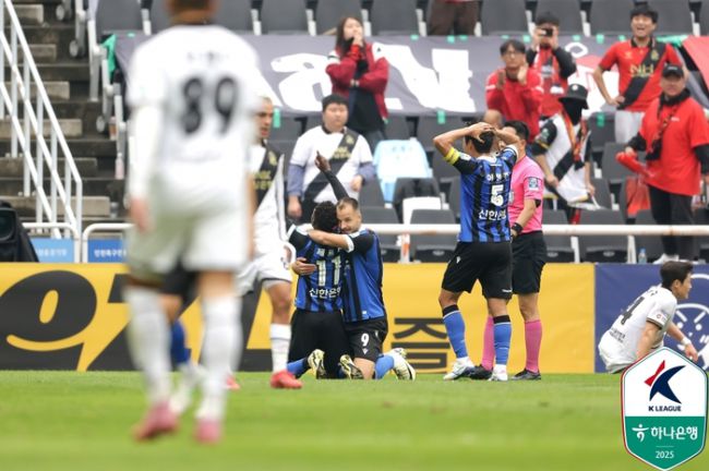 인천 유나이티드 제르소(11)가 26일 인천축구전용경기장에서 열린 ‘하나은행 K리그2 2025’ 36라운드 경남FC와 홈경기에서 전반 34분 선제골을 터뜨린 뒤 무고사와 얼싸안으며 기뻐하고 있다. 사진 | 한국프로축구연맹 사진 | 한국프로축구연맹 안방에서 흘린 1년 전 눈물은 환희로 바뀌었다. K리그2 인천 유나이티드가 조기 우승에 성공, 한 시즌 만에 1