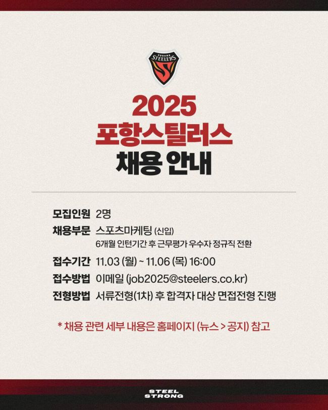 사진=포항 스틸러스 제공 프로축구 포항 스틸러스가 프로축구 및 스포츠 산업에 종사할 신입 인턴 사원을 공개 채용한다. 모집분야는 스포츠 마케팅 직렬 2명이다. 지원자격은 스포츠 산업에 대한 이해와 프로축구단 포항 스틸러스의 가치에 공감하는 자로서, 학사 학위 이상을 보유(2026년 2월 졸업 예정자 가능)하고 포항 지역 근무가 가능해야 한다. 국가공무원법