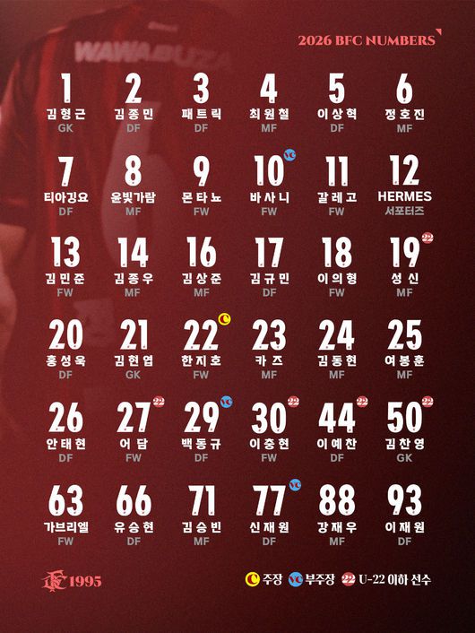[사진] 부천 FC 제공 사상 첫 1부 리그 무대에 도전장을 내민 부천FC1995(구단주 조용익 부천시장, 이하 부천)가 2026시즌 '스쿼드 넘버'를 확정하고 본격적인 출격 준비를 마쳤다. 부천은 6일 공식 채널을 통해 2026시즌 선수단 등번호를 발표했다. 이번 배정은 팀의 전통을 상징하는 번호 유지와 새로운 도약을 위한 변화, 그리고 팀의 무게감을 더