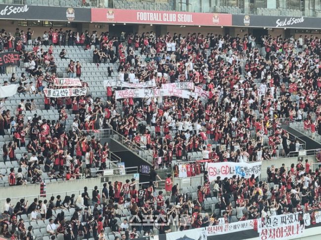 서울-포항 경기 지켜보는 기성용, “김기동 나가”와 기성용 ‘응원가’ 공존…뿔난 서울 팬 ‘비판’ 걸개로 항의 시위[현장메모]