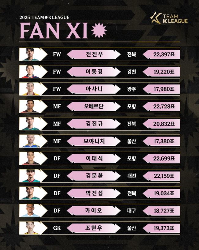 [인터풋볼] 주대은 기자 = 한국프로축구연맹(이하 '연맹')이 이달 30일(수) 수원월드컵경기장에서 열리는 '2025 쿠팡플레이 시리즈' 1경기 뉴캐슬 유나이티드와 맞대결에 나설 팀 K리그 '팬 일레븐' 명단을 발표했다. '팬 일레븐'은 K리그1 12개 구단이 제출한 팀별 베스트11을 바탕으로 연맹 기술위원회(TSG)가 포지션별 4배수 후보를 선정한 뒤,