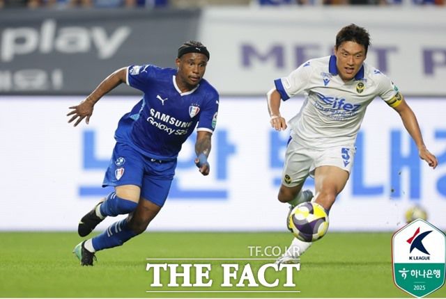 26, 27일 하나은행 K리그2 2025 22라운드 7경기 프리뷰 수원 삼성이 무더위와 함께 뜨거운 연승행진을 펼치며 호시탐탐 인천의 1위 자리를 위협하고 있다. 사진은 수원과 인천의 올 시즌 경기 장면../K리그 폭염보다 뜨거운 수원삼성의 연승 행진이 이어지고 있다. 최근 3연승을 포함해 5경기 연속 무패행진(4승1무)를 달리며 어느새 인천 유나이티드의