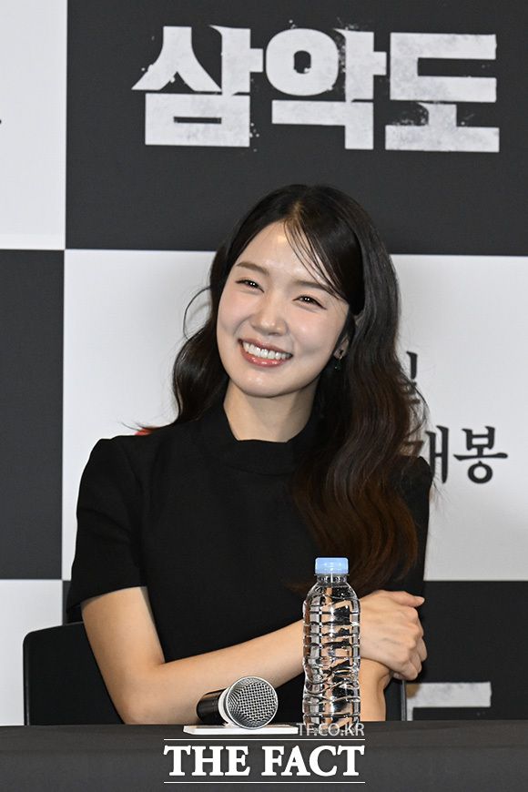 배우 조윤서가 5일 오후 서울 용산구 CGV용산아이파크몰에서 열린 영화 '삼악도' 언론시사회 및 기자간담회에 참석해 미소를 짓고 있다. 채기준 감독의 '삼악도'는 일제강점기 후 흔적을 감춘 사이비 종교를 둘러싼 비밀과 금기가 숨겨진 마을에서 목격한 지옥을 그린 미스터리 공포 영화다. 배우 조윤서는 탐사 보도 프로그램 PD 채소연 역을, 배우 곽시양이 사이비