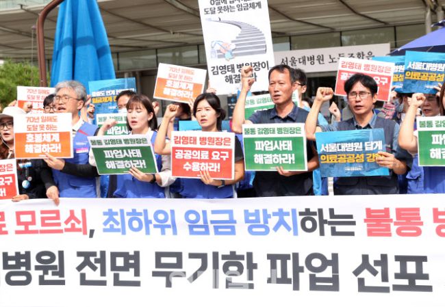 민주노총 의료연대본부 서울대병원분회 노조원 등이 22일 서울 종로구 서울대병원 본관 앞에서 기자회견을 하고 있다. 서울대병원노조는 24일부터 무기한 전면파업에 돌입한다고 밝혔다.