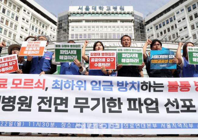 민주노총 의료연대본부 서울대병원분회 노조원 등이 22일 서울 종로구 서울대병원 본관 앞에서 기자회견을 하고 있다. 서울대병원노조는 24일부터 무기한 전면파업에 돌입한다고 밝혔다.
