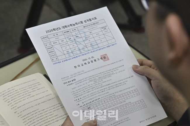 5일 서울 광진구 광남고등학교에서 학생들이 '2026학년도 대학수학능력시험 성적통지표'를 교부받고 있다. 한편, 대학 정시모집 원서 접수는 29일부터 31일까지 진행되고, 내년 2월 2일까지 합격자 발표를 한다. 사진은 이번 수능에서 만점을 받은 광남고 왕정건 학생의 성적표.