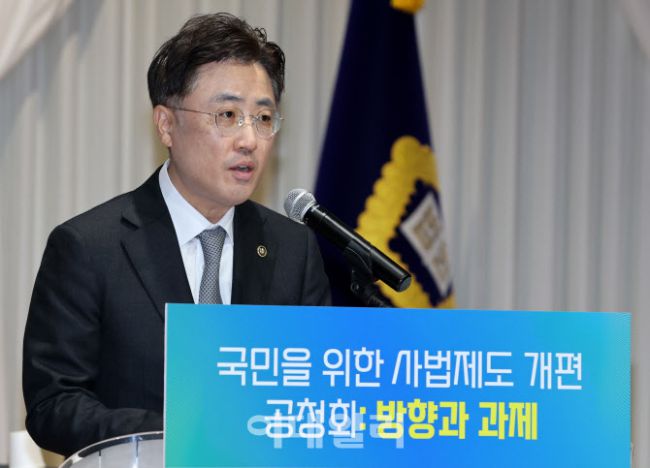 이진수 법무부 차관이 9일 서울 서초구 서울법원종합청사에서 열린 '국민을 위한 사법제도 개편 과제 공청회'에 참석해 축사를 하고 있다.