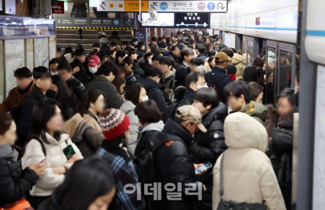서울 시내버스 무기한 총파업 이틀째인 14일 서울역이 출근길 인파로 붐비고 있다.