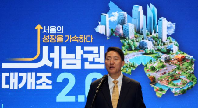 [포토] 오세훈 서울시장이 5일 서울 중구 서울시청에서 '서남권 대개조 2.0'을 발표하고 있다. 오세훈 서울시장이 5일 서울 중구 서울시청에서 ‘서남권 대개조 2.0’을 발표하고 있다.