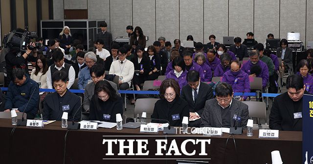 박희영 용산구청장과 '10·29 이태원 참사 진상규명 청문회' 참석자들이 13일 서울 오전 서울 중구 은행회관에 마련된 청문회장에서 희생자들을 추모하는 묵념을 하고 있다. 이태원참사 진상규명과 재발방지를 위한 특별조사위원회는 12일부터 청문회를 진행하고 있다. 청문회 둘째 날인 이날은 참사 발생 이후 대응 및 수습 과정에 대한 질의가 이어졌다. 한편, 이날