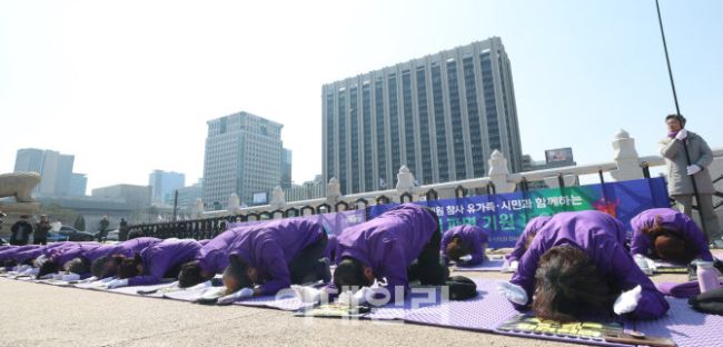 10.29 이태원 참사 유가족협의회와 시민대책회의 관계자들이 19일 오후 서울 종로구 광화문광장 월대 앞에서 '윤석열 대통령 파면 기원' 159배를 하고 있다.
