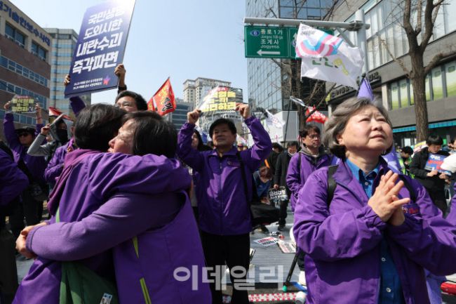 헌법재판소의 윤석열 전 대통령의 탄핵 인용이 발표된 4일 서울 종로구 안국동사거리 일대에서 이태원 참사 유가족들이 눈물 보이고 있다.