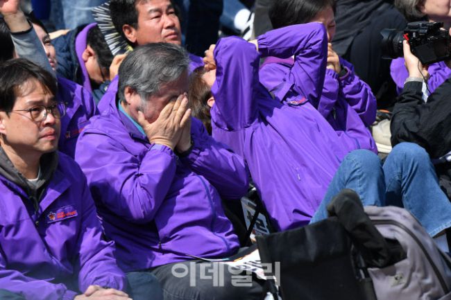 헌법재판소의 윤석열 전 대통령의 탄핵 인용이 발표된 4일 서울 종로구 안국동사거리 일대에서 이태원 참사 유가족들이 눈물을 흘리고 있다.