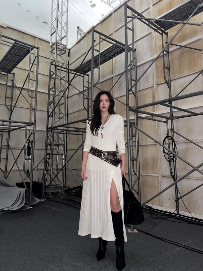 사진 = 임수향 인스타그램 임수향이 아이보리 롱 니트 드레스와 스터드 힙 벨트, 블랙 롱부츠를 매치해 백스테이지의 차분한 공기를 단번에 집중시켰다. 임수향은 자신의 인스타그램에 "Seoul Fashion Week - LIE"라는 멘트를 남기며 사진을 올렸다. 사진 속 임수향은 철제 비계와 케이블이 얽힌 백스테이지로 보이는 공간을 배경으로 서 있다. 잔결이