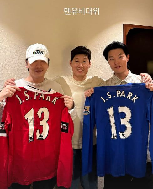지난해 결별 소식 알린 두 남배우, 박지성 만났다…유니폼 들고 헤벌쭉
