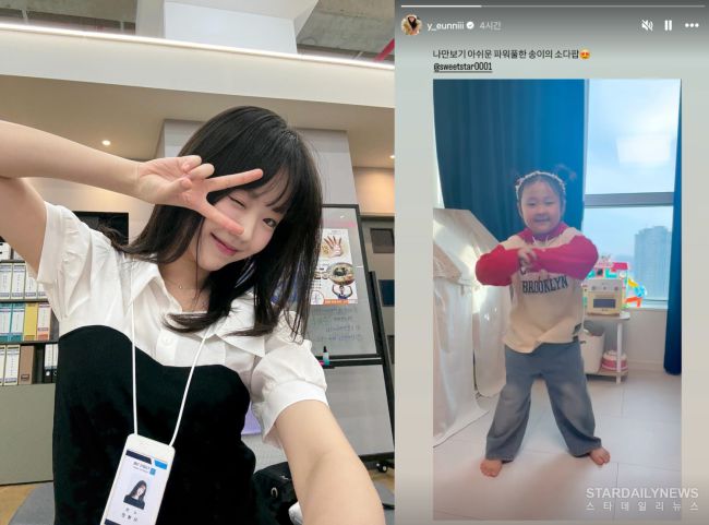 배우 지예은이 건강 회복 후 근황을 전했다. 지예은은 지난 27일 자신의 인스타그램에 "나만 보기 아쉬운 파워풀한 송이의 소다팝"이라는 글과 함께 영상을 공개했다. 공개된 영상에는 하하와 별 부부의 막내딸 송이 양이 넷플릭스 영화 '케이팝 데몬 헌터스'의 '소다 팝' 춤을 추는 모습이 담겼다. 송이 양은 숨길 수 없는 끼로 뛰어난 춤 실력을 자랑했다. 지예