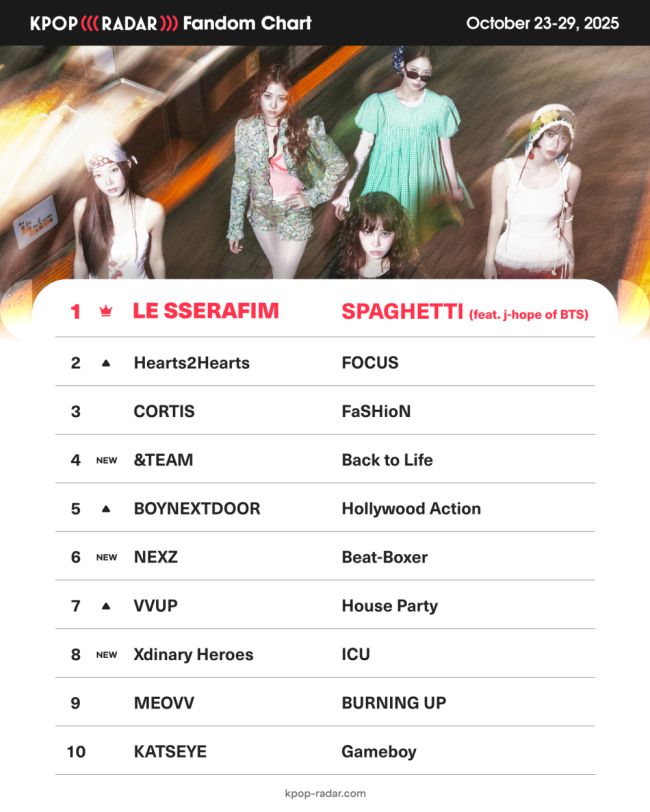 그룹 르세라핌이 '케이팝레이더(K-POP RADAR)' 위클리 팬덤 차트에서 1위를 차지했다. 위클리 팬덤 차트는 한 주간 팬덤 지표가 가장 크게 성장한 아티스트를 증감률 기준으로 순위를 매기는 차트다. 31일 발표에 따르면, 르세라핌은 방탄소년단 제이홉이 피처링한 신곡 '스파게티(SPAGHETTI)'로 정상에 올랐다. 이에 앞서 신예 코르티스가 8주 연속