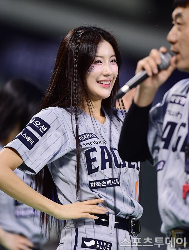 2025 신한은행 SOL Bank KBO리그 한화 이글스와 두산 베어스의 경기가 9일 서울 잠실야구장에서 열렸다. 한화 치어리더 김연정이 환한 미소로 응원을 하고 있다. 2025.04.09. [스포츠투데이 권광일 기자 sports@stoo.com]