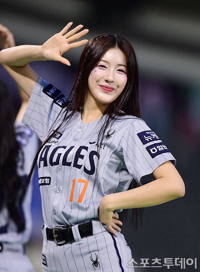 2025 신한은행 SOL Bank KBO리그 한화 이글스와 두산 베어스의 경기가 9일 서울 잠실야구장에서 열렸다. 한화 치어리더 김연정이 환한 미소로 응원을 하고 있다. 2025.04.09. [스포츠투데이 권광일 기자 sports@stoo.com]