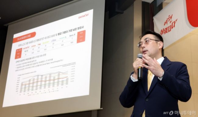 이경민 이스타항공 커머셜본부장이 3일 부산 상공회의소에서 '부산에서도 이스타항공!' 노선 설명회를 갖고 있다. 이 본부장은 부울경 지역 여행사 임직원 약 80명을 대상으로 현재 부산에서 운항하고 있는 이스타항공의 노선 소개와 함께 오는 10월 26일부터 운항하는 신규 취항지, 운영 전략에 대해 설명했다. 부산=김창현 기자 chmt@mt.co.kr Copyr