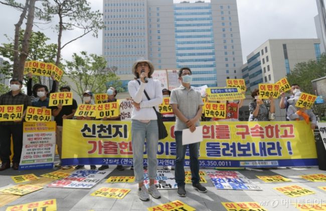 신천지 이만희 총회장의 영장실질심사일인 31일 오전 경기도 수원지방법원 앞에서 신천지 피해자들의 모임인 전피연 관계자들이 구속수사 촉구 기자회견을 하고 있다. 수원(경기)=김휘선 기자 hwijpg@mt.co.kr