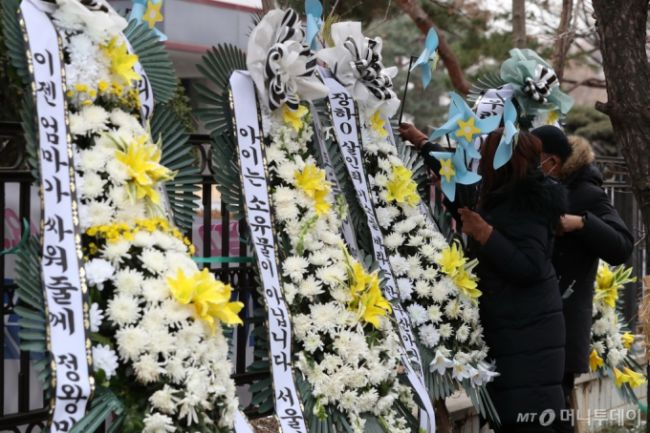 양부모 학대로 16개월만에 숨진 정인이 사건 첫 재판을 이틀 앞두고 대한아동학대방지협회 관계자들이 11일 서울 양천구 남부지방검찰청 담장 앞에 정인양의 추모와 가해자의 엄벌을 촉구하는 근조화환을 설치하고 있다. 이기범 기자 leekb@