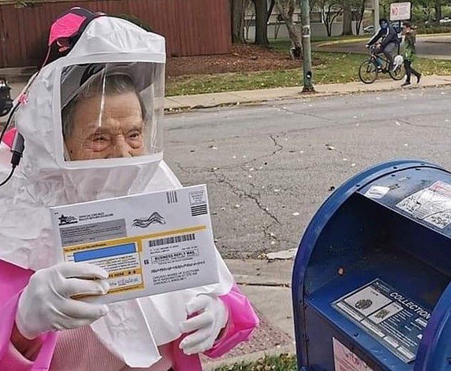 [서울신문 나우뉴스] 미국 대선이 한 달도 채 남지 않은 가운데 코로나19 예방을 위해 '중무장'하고 우편투표를 하는 할머니의 모습이 화제를 모으고 있다. 지난 5일(현지시간) ABC뉴스 등 현지언론은 머리부터 발끝까지 보호장비(PPE)로 무장하고 우편투표하는 올해 102세 할머니 베아 럼킨의 사연을 보도했다. 시카고 출신의 전직 교사인 할머니는 최근 PP