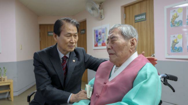 [the300] 권오을 국가보훈부 장관이 설날을 맞아 12일 오후 경기도 수원시 보훈원을 방문하여 오성규 애국지사를 만나 위문을 하고 있다. 조성준 기자 develop6@mt.co.kr Copyright ⓒ 머니투데이 & mt.co.kr. 무단 전재 및 재배포, AI학습 이용 금지.