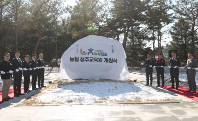강호동(왼쪽 다섯번째) 농협중앙회장이 5일 농협 청주교육원에서 주요 귀빈들과 개원식을 하고 있다. 이날 개원식에는 강호동 회장과 강태영 농협은행장을 비롯한 약 100여 명의 임직원과 충북도지사, 도의회의장, 청주시장, 시의회의장, 국회의원 등 50여 명의 외부인사가 참석했다. 청주교육원은 1982년「농협중앙회 충북연수원」으로 개원해 초기에는 지역농협 직원