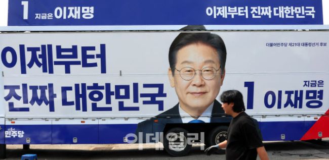 제21대 대통령 선거 공식 선거운동을 하루 앞둔 11일 경기도 양주시의 한 차량광고업체에서 관계자들이 이재명 더불어민주당 대통령 후보 선거운동 유세차량을 제작하고 있다.
