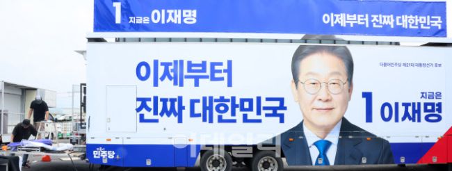제21대 대통령 선거 공식 선거운동을 하루 앞둔 11일 경기도 양주시의 한 차량광고업체에서 관계자들이 이재명 더불어민주당 대통령 후보 선거운동 유세차량을 제작하고 있다.